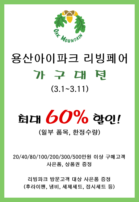 이번 가구대전은 다양한 이벤트와 사은품은 물론이고 최대 60퍼센트까지 할인하는 행사이니 놓칠 수 없는 기회가 되겠죠?